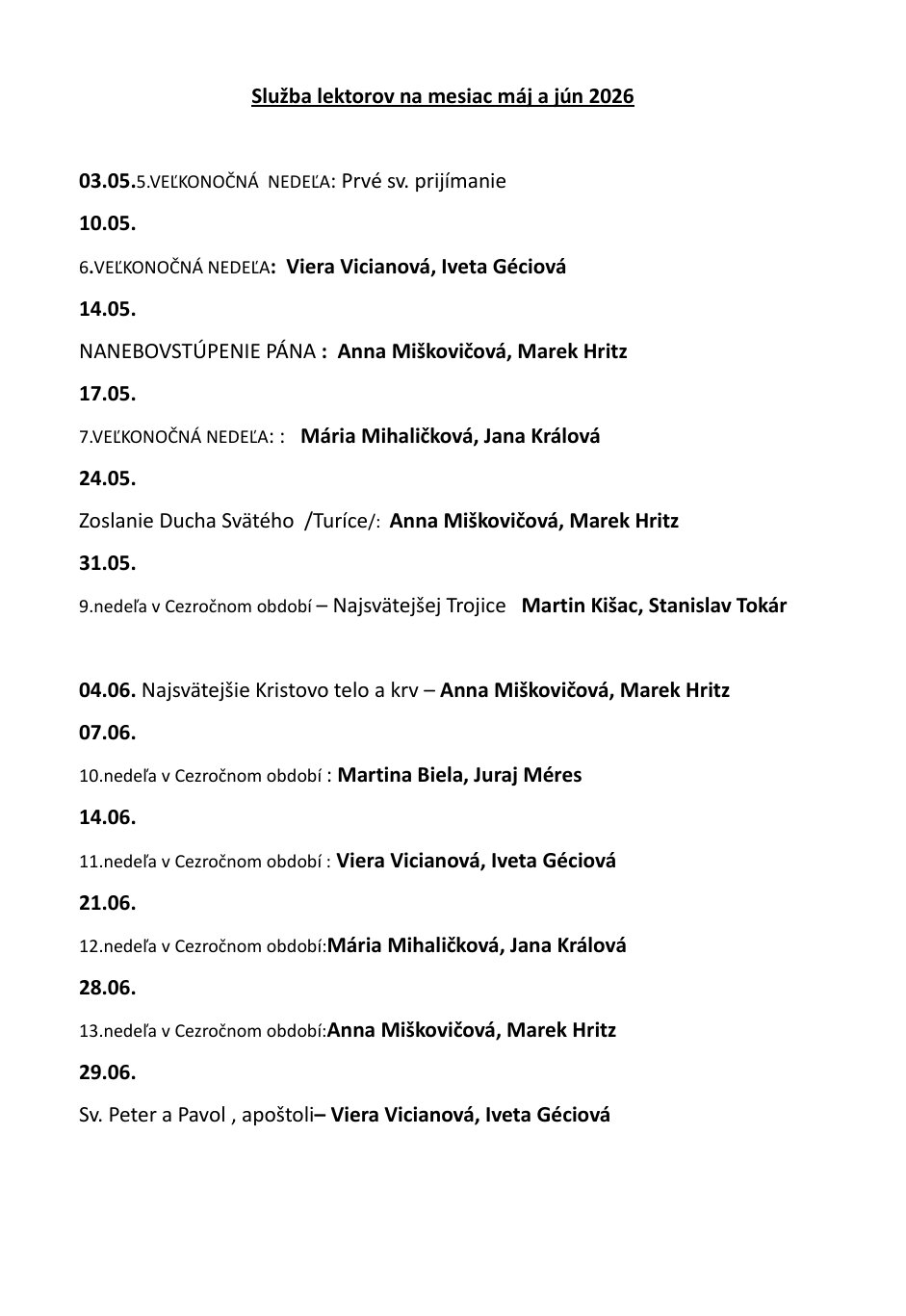 Služba lektorov na mesiac máj a jún 2026